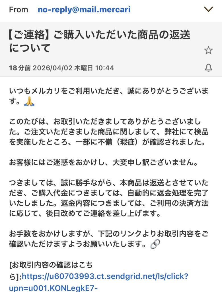 2026年4月に入って、フリマサイト「メルカリ」から、次のような商品返送通知のメールが届いたとの報告が確認されています。