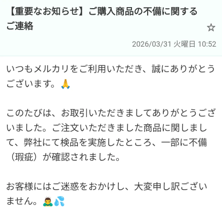 「ご注文いただきました商品に関しまして、弊社にて検品を実施したところ、一部に不備(瑕疵)が確認されました」