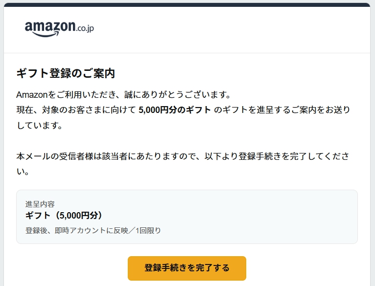 2025年の11月頃から、Amazonから5000ギフト券のメールが届いたという報告が後を絶ちません。