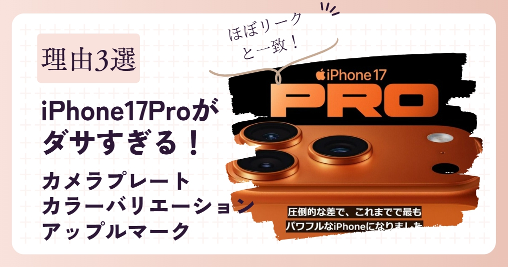 2025年9月10日、9月19日より発売開始のiPhone17Proが情報解禁されました。 しかしAppleファンからはデザインがダサい!と批判の声が上がっています。 最近毎回言われてますが… 今回はiPhone17Proがダサいと言われる3つの理由について調べてみました。 iPho... -