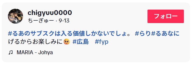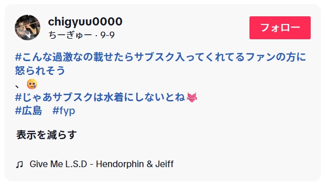 ちーぎゅーさんのハッシュタグには、つねに「#広島」「#fyp」とあり、広島在住であると思われます。