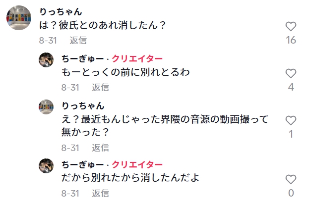 ちーぎゅーさんは、8月末までに彼氏とは別れています。