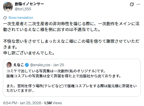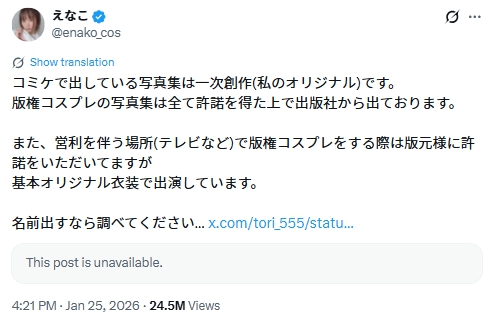2026年1月25日、コスプレイヤーで有名なえなこさんのXのポストが話題になっていますね。