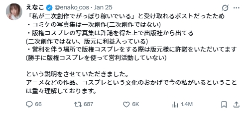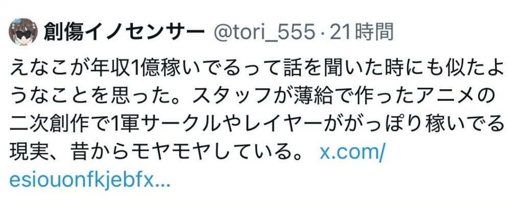 発端は二次創作に関してのポストにえなこさんの名前が名指しされたため、えなこさんが引用ツイで収入源を明確にしたことでした。世間では業界のシステムの問題を一個人にあげるべきではないという考えが多い一方、二次創作の恩恵が直接的収入だけには留まらないという意見もあります。
