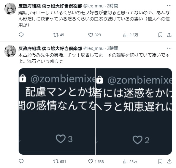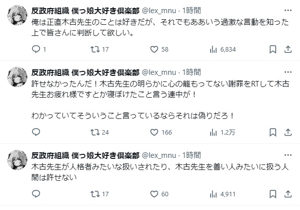 反政府組織僕っ娘大好き倶楽部さんは、文筆家の木古おうみさんの裏垢をリークした人物として話題になりました。