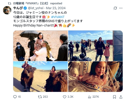 『VIVANT』続編では、ジャミーン役がモンゴルの俳優のナンディンちゃんから本間さえちゃんに交代となり話題になっています。