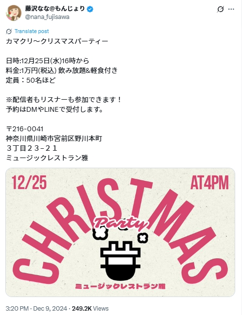 クリスマスパーティーなどは「ミュージックレストラン雅」で行われており、リスナーも参加することができます。