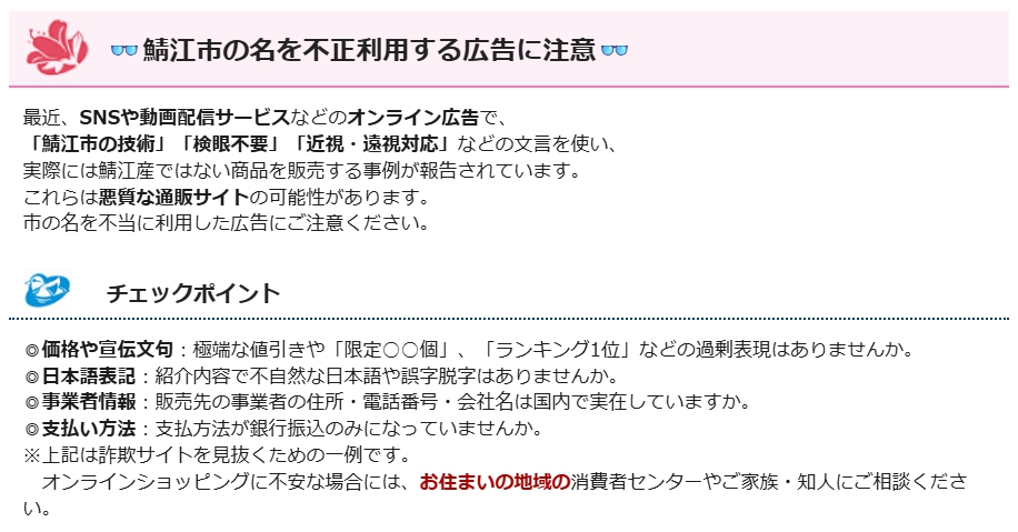 最近、SNSや動画配信サービスなどのオンライン広告で、「鯖江市の技術」「検眼不要」「近視・遠視対応」などの文言を使い、実際には鯖江産ではない商品を販売する事例が報告されています。