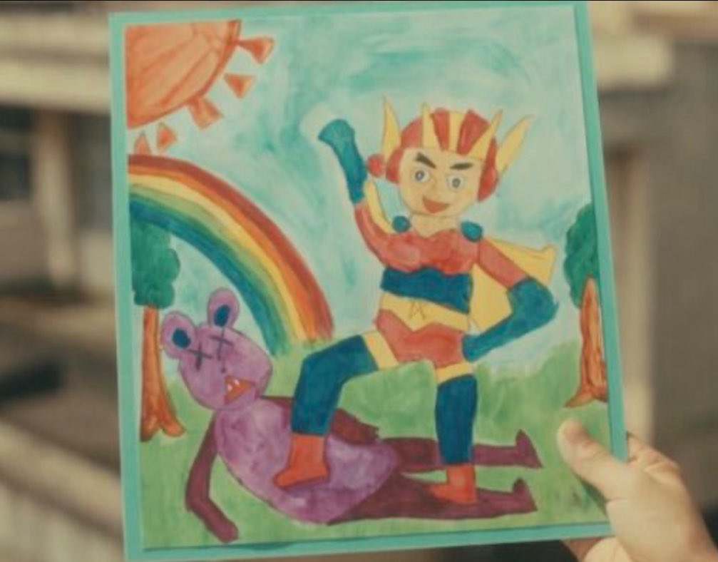 キングはヒーローの絵を描いたようですが、やっつけているのは怪人でも怪物でもなく「紫の熊」です。