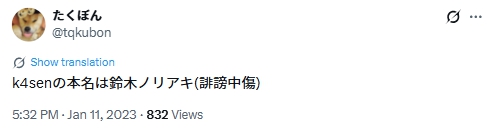 過去にk4senさんの本名ネタとして、「k4senの本名は鈴木ノリアキ」というミームが流行りました。