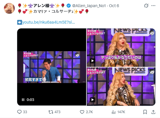 2025年10月6日、YouTubeチャンネル『NewsPicks /ニューズピックス』に出演したアレン様の発言「カマリアコルサージュ」が話題になっています。