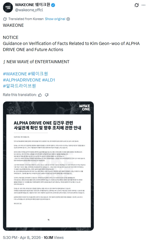 2026年4月8日、WAKEONEが公式Xで公式声明を発表しました。