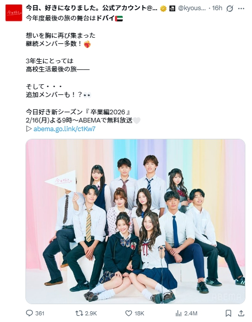 2026年2月16日から開始のABEMA人気番組『今日、好きになりました。(以降:今日好き)』の新メンバーが発表されましたね。