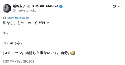 毬谷友子さんの公式Xでは、2021年時点では「結婚した事ない」と語っています。