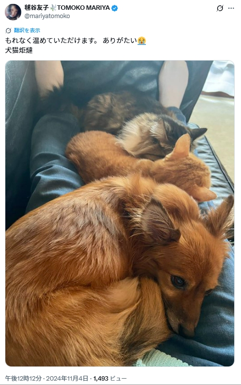 毬谷友子さんの愛猫愛犬は基本的に保護猫や保護犬で、Xでも動物の投稿が多いので、かなりの動物好きだと思われます。