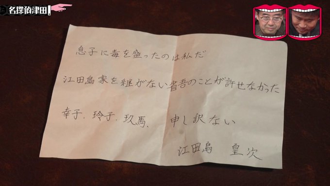 そして劇団ひとりさんの館林の実家へ着いてすぐ第2の殺人が起きますが、その場に残されていた遺書が偽造だと推理しました。
