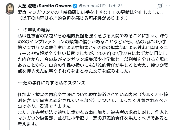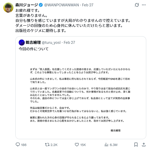 ユーザー「今回の件で発言をしていない漫画家の方を責める空気が広がらない事を願います」