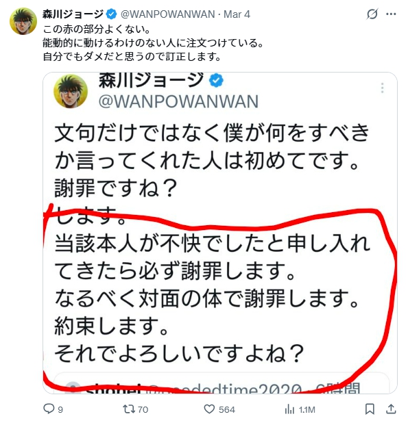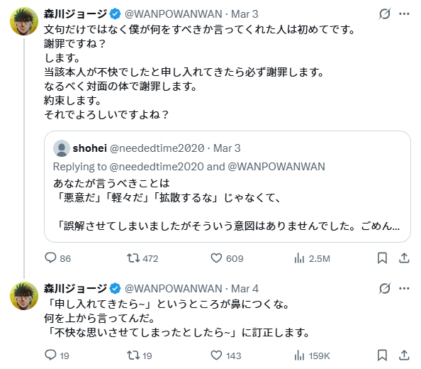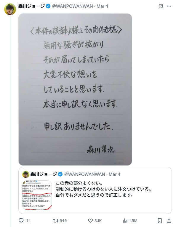 しかしこれには森川ジョージさんご本人から謝罪ポストがありました。