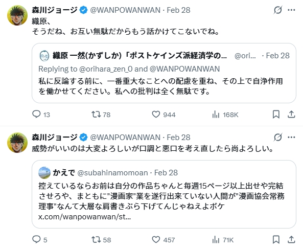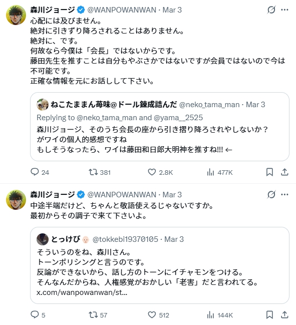 しかし森川ジョージさんはリプライをすべてに、引用リプでレスバ(レスバトル)して炎上しています。