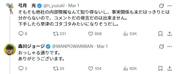 森川ジョージさんは、「大局」という言い回しと「草津のゴタゴタ」への同意から、リプライには非難の声も上がっていました。