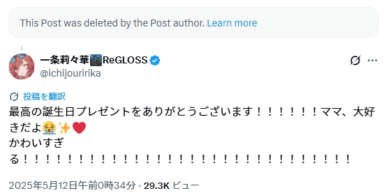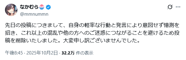 2025年10月1日、なかむらさんは、後日削除することとなったポストを配信しました。