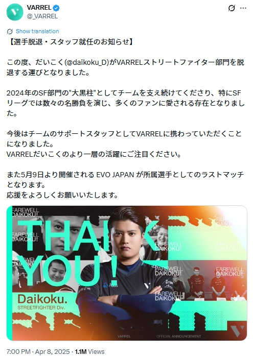 だいこく選手は、VARRELに所属していたプロゲーマーです。