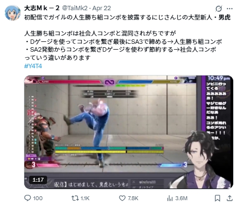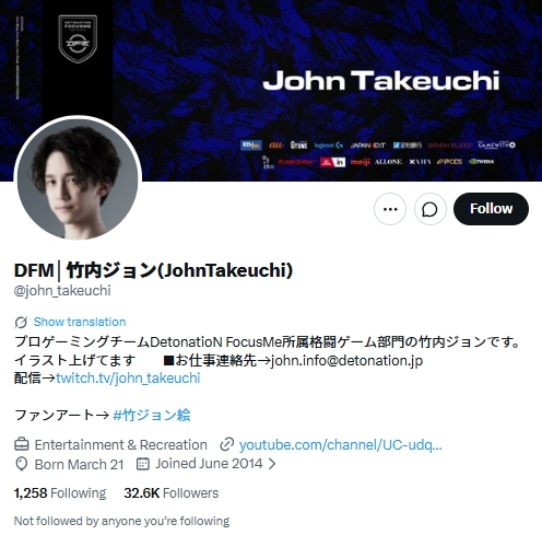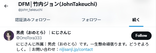 男虎さんのデビュー前、プロゲーマーの竹内ジョンさんが男虎さんをフォローしたことが話題になりました。