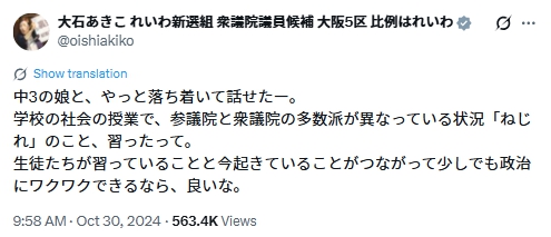 また大石あきこさんの公式Xでも娘さんとのやりとりがポストされています。