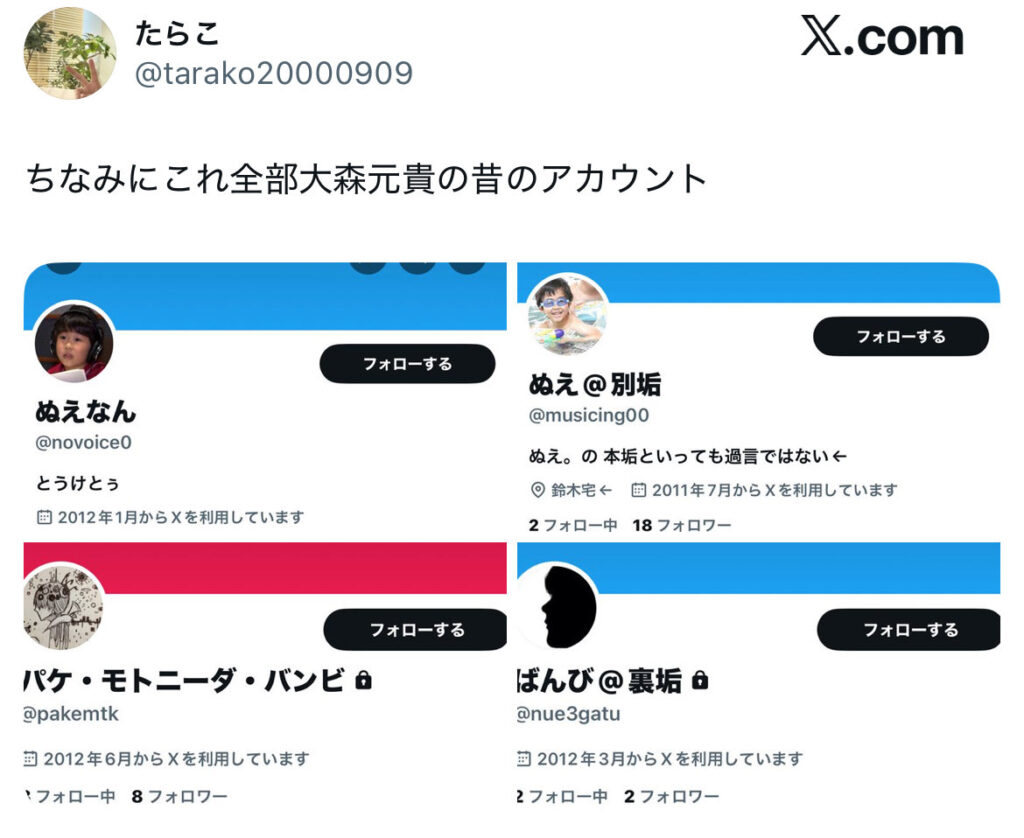 大森元貴さんのX(旧ツイッター)の昔のアカウントは「ぬえなん(@novoice0)」以外にも複数あるものと思われます。