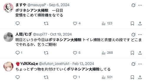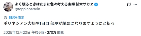 2025年12月、SNSでポリネシアン大掃除が話題になっています。