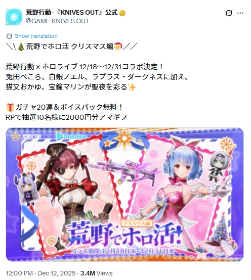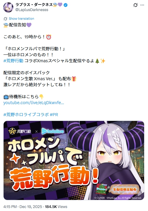 2025年12月19日、ラプラスさんはスマホゲーム「荒野行動」のライブ配信をしていました。