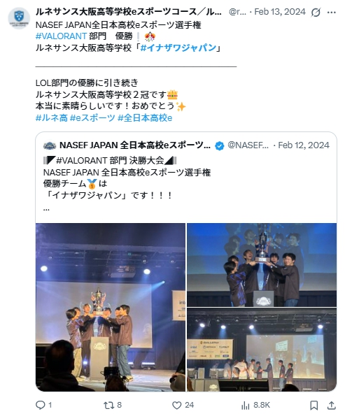 HLいななざわ選手は、2024年2月に「NASEF JAPAN全日本高校eスポーツ選手権」にイナザワジャパンのキャプテンとして出場していました。