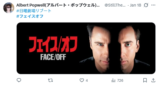 第1話を見た視聴者からは、1997年のハリウッド映画「フェイスオフ」を思い出す人が多いようです。