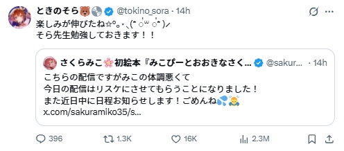 さくらみこさんはときのそらさんとのコラボ配信で、開始時間を過ぎてから30分の時間変更をした上で、変更後の時間を過ぎてリスケを発表したことが批判さてていました。ときのそらさんはさくらみこさんに寛大なポストを残しており、神対応!と株が上がっています。