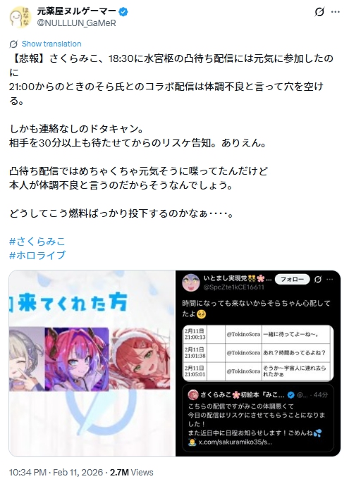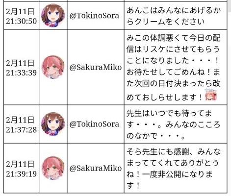 さくらみこさんとときのそらさんのコラボ配信は2月11日21時からでしたが、さくらみこさんが無断遅刻したと言われています。