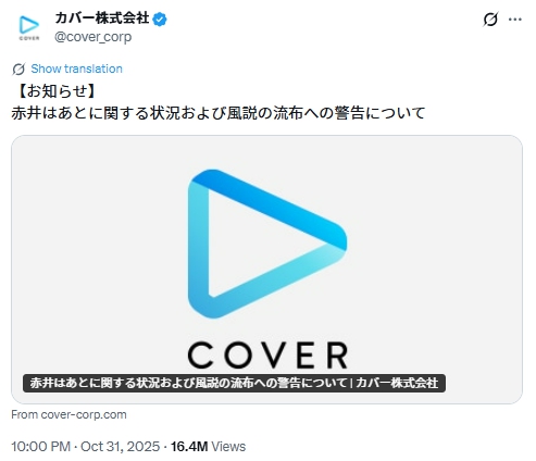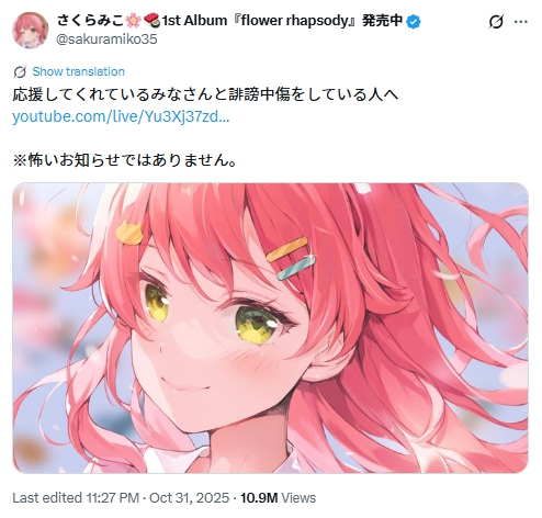 2025年10月29日0時の赤井はあとさんの暴露ライブについて、ホロライブとさくらみこさんがそれぞれ声明を出しています。
