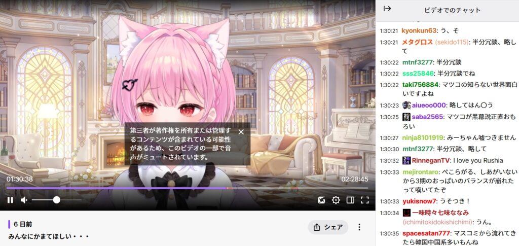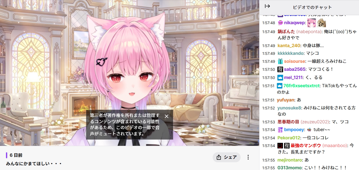 2025年12月5日、ホロライブ在籍時に潤羽るしあさんとして活躍していたみけねこさんのTwitchが音声削除される事件がありました。