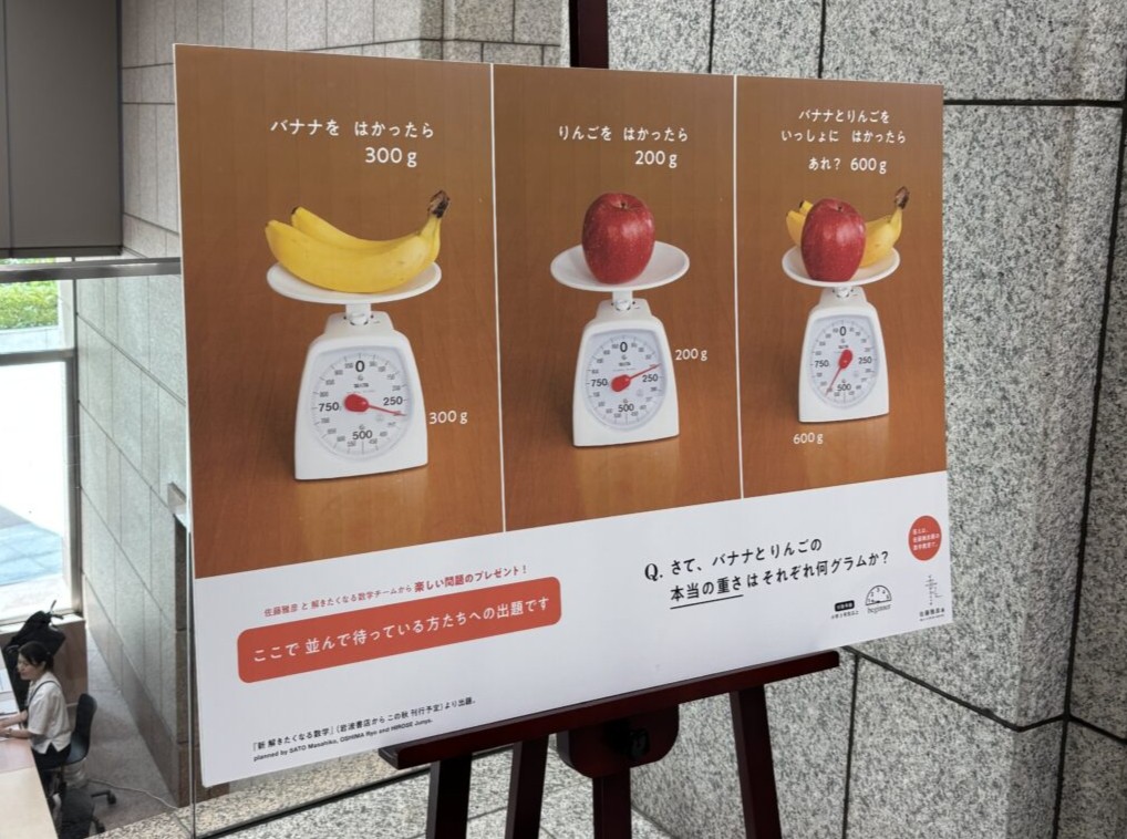 佐藤雅彦展の「りんごとバナナの問題」は、「計算の庭」までの待合通路に展示されている時間つぶしの工夫でした。「りんごとバナナの問題」は、2025年11月20日の「新・解きたくなる数学」に冒頭問題として掲載されており、目次に「狂ったはかり」とあるように、100gの誤差が出る秤と前提して、バナナ400gとりんご300gが本当の重さと推察されています。