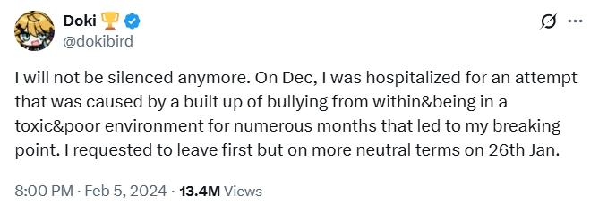 セレンさんはにじさんじENの契約解除通知後、前世のDokibirdさんのアカウントで次のようにポストしています。
