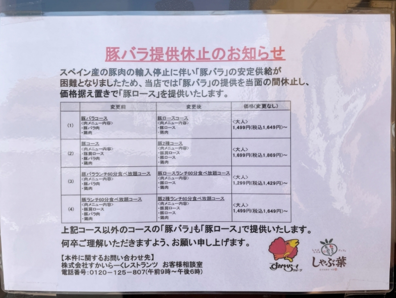 スペイン産の豚肉の輸入停止に伴い「豚バラ」の安定供給が困難となりましたため、当店では「豚バラ」の提供を当面の間休止し、価格据え置きで「豚ロース」を提供いたします。