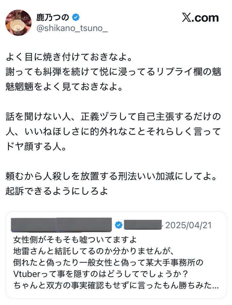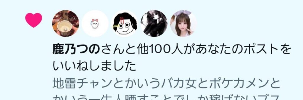 鹿乃つのさんは、同時期に地雷チャンへ向けて誹謗中傷していたポストへいいねをしました。