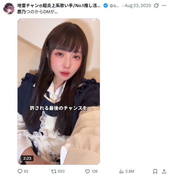 コスプレイヤーとして活躍する鹿乃つのさんに対して、歌い手として活動するインフルエンサーの地雷チャンが、公式Xで度々言及する姿が目撃されています。