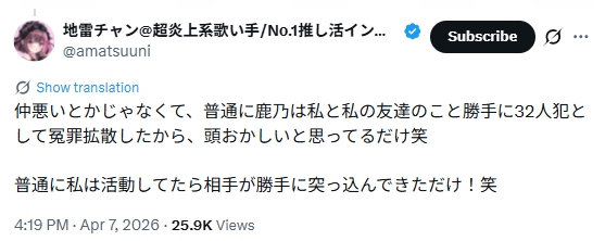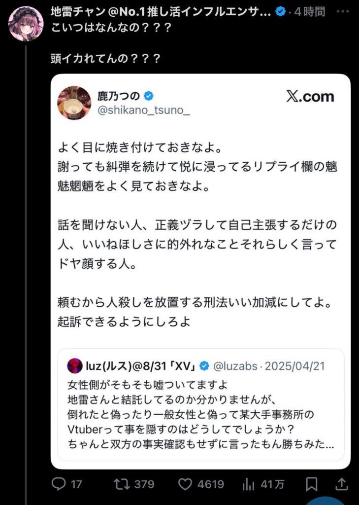 鹿乃つのさんのポストに対して、地雷チャンは批判しています