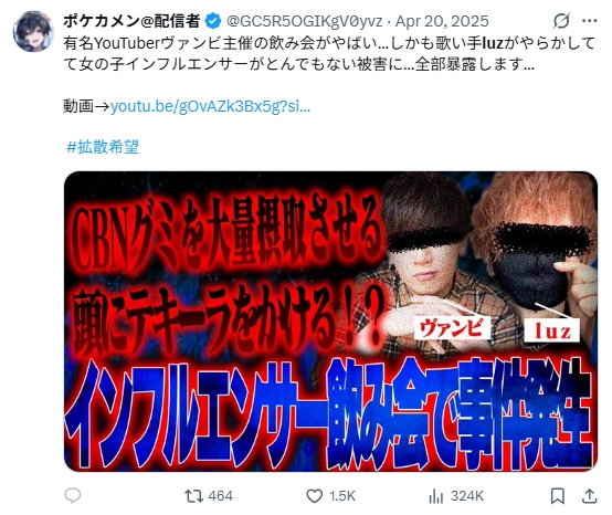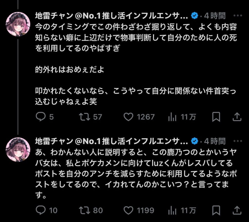 2025年4月にはポケカカメンさんからのluzさんの暴露動画が出ていたため、鹿乃つのさんはそれを指摘してのポストだと認識されました。