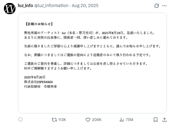 2025年8月20日、鹿乃つのさんが歌い手のluzさん逝去についてポストしたことがきっかけです。