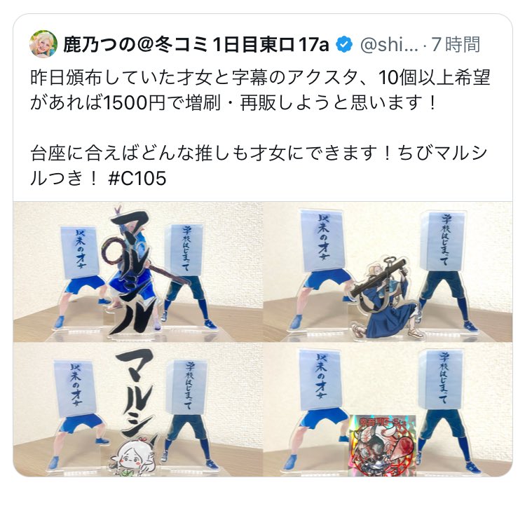 鹿乃つのさんは、2024年8月の夏コミでの投稿が話題となり、その時の画像をモチーフにアクスタを制作しました。