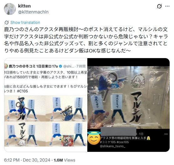 そもそも版権作品の二次創作事態がかなりグレーゾーンのため、公式そっくりの文字を使ったグッズには懸念を覚える人は多いようでした。