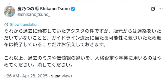 万博コスでの炎上以降にアクスタ炎上が再燃した際、ガイドライン違反だったため終了したと報告しています。