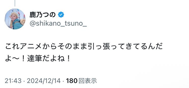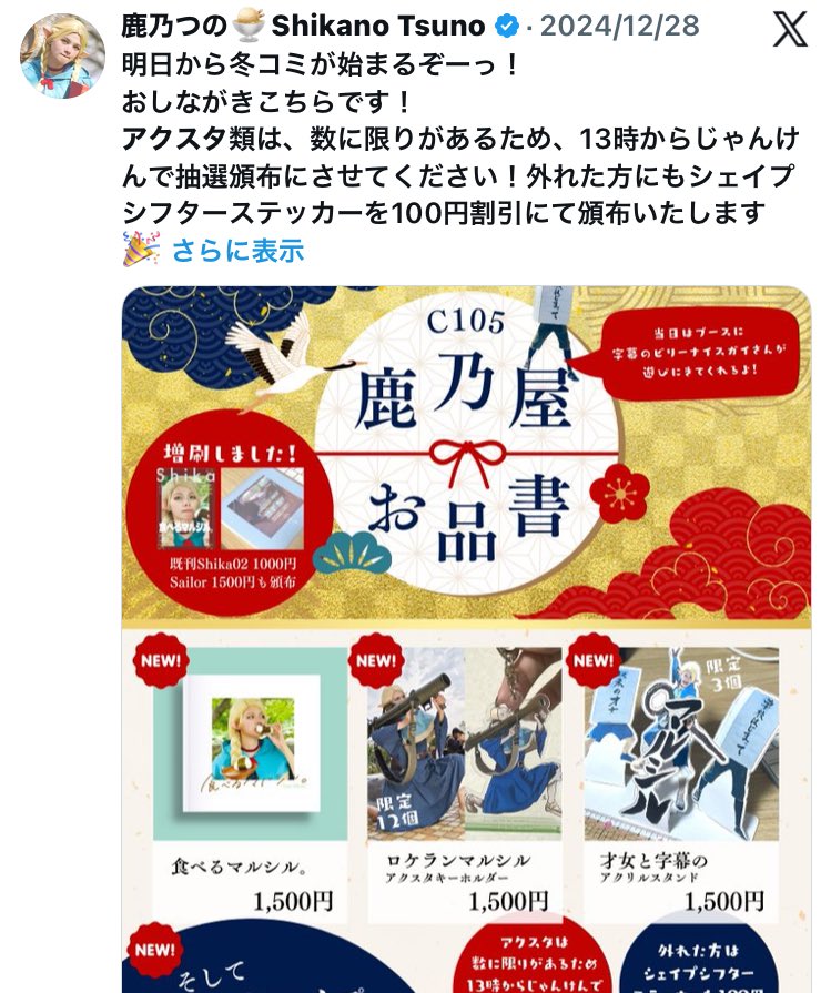 2024年12月30日・31日、鹿乃つのさんは冬コミへサークル名「鹿乃屋」で参加していました。