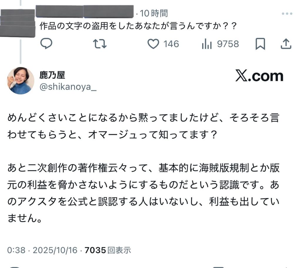 鹿乃つのさんは、公式そっくりの文字を使用したアクスタはオマージュとの認識のようです。